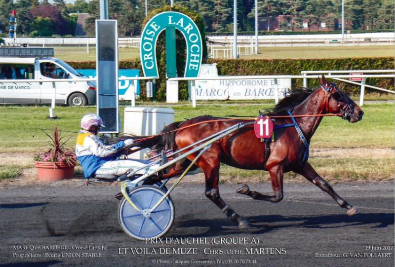 Na tweemaal winst op de koersbaan in Ghlin, doet Et Voila de Muze met Christophe Martens zijn kunstje op de koersbaan van Le Croise Laroche in 1' 18" 4 in de Prix d'Auchel (Groupe A) 15 000€.